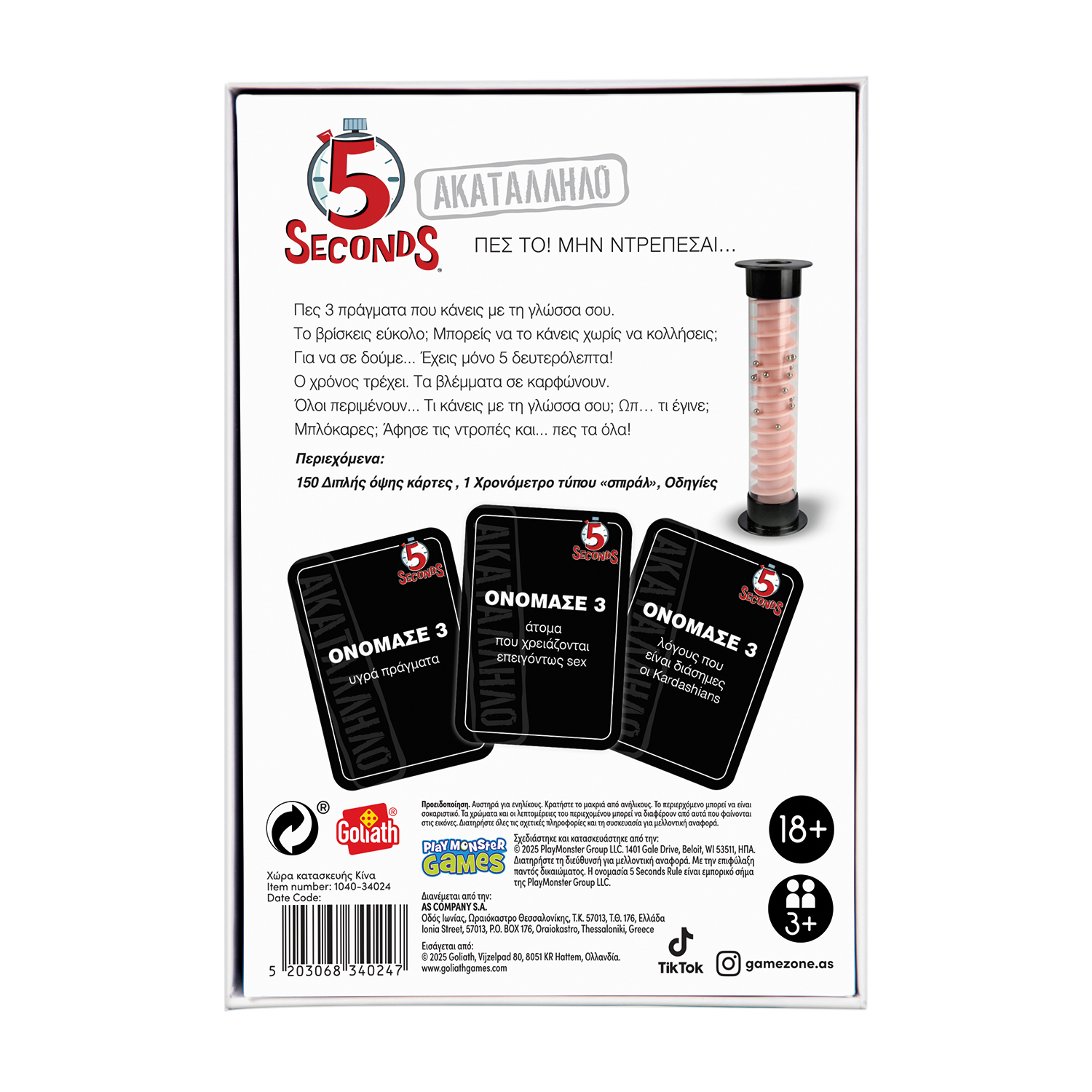 “Πες το, μην ντρέπεσαι… Πες 3 πράγματα που κάνεις με τη γλώσσα σου. Πόσο δύσκολο μπορεί να είναι; Μόνο που έχεις 5 δευτερόλεπτα! Μπορείς να το κάνεις χωρίς να κολλήσεις; Για να σε δούμε… Ο χρόνος τρέχει. Τα βλέμματα σε καρφώνουν. Όλοι περιμένουν… Ωπ… τι έγινε; Μπλόκαρες; Άφησε τις ντροπές και… πες τα όλα! Αριθμός Παικτών: 3+ Καταλληλότητα Ηλικίας: 18+ Χρονών Μέση Διάρκεια Παιχνιδιού: 20 λεπτά Το παιχνίδι περιλαμβάνει – 150 κάρτες με 300 ερωτήσεις – 1 Χρονόμετρο τύπου «σπιράλ» – Οδηγίες Το προϊόν διαθέτει περιεχόμενο το οποίο απευθύνεται αυστηρά σε ενήλικες.”