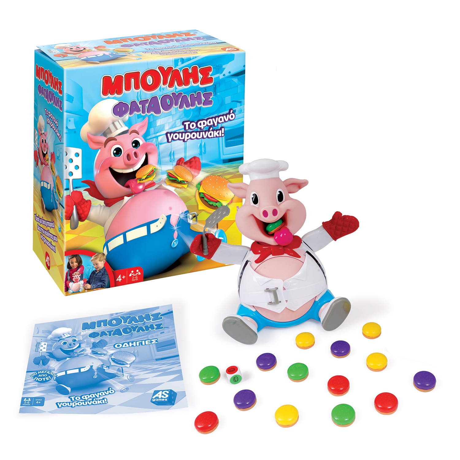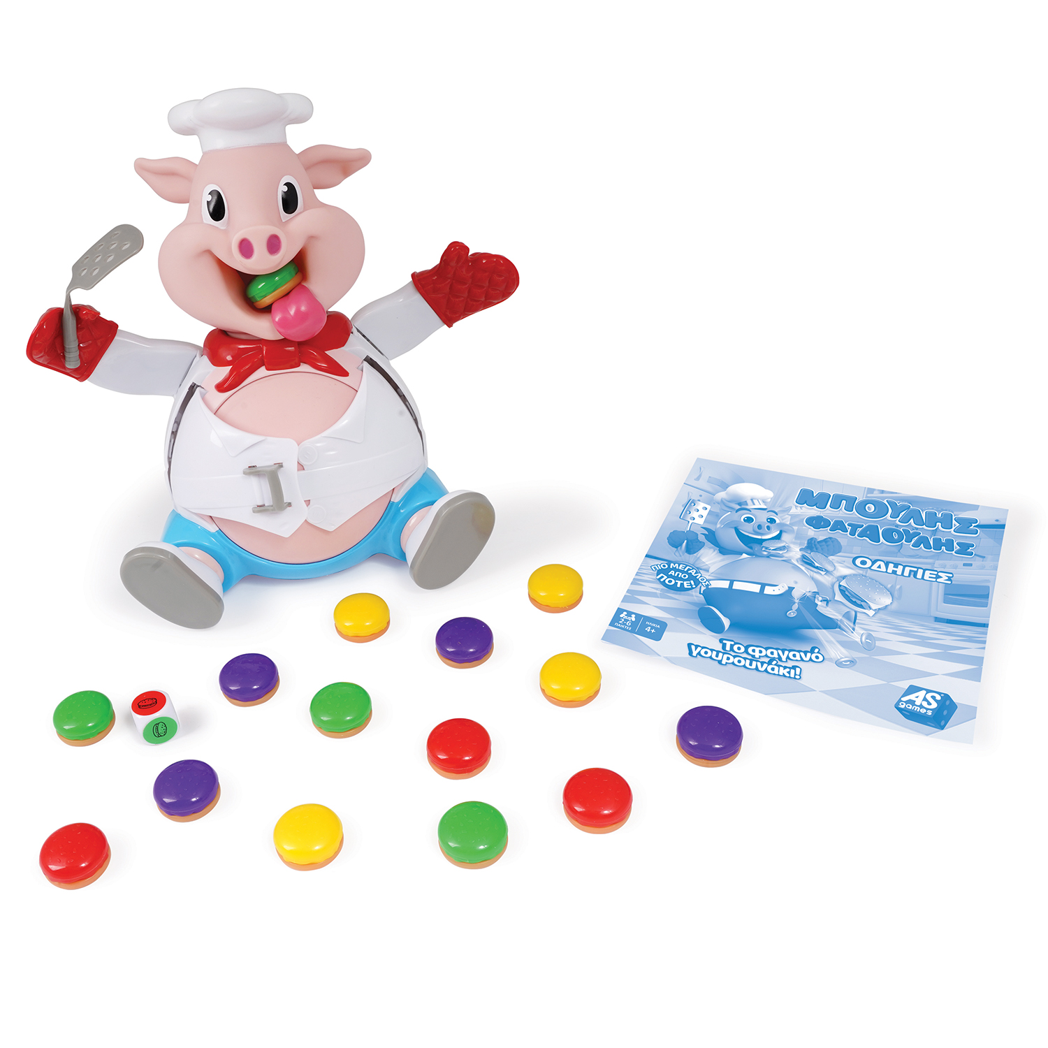 Τάισε τον Μπούλη Φαταούλη και δες την κοιλίτσα του να φουσκώνει! Ρίξε το ζάρι, πάρε ένα χάμπουργκερ στο ίδιο χρώμα και τάισέ τον. Πίεσε το κεφάλι του όσες φορές δείχνει το χάμπουργκερ. Η κοιλίτσα του φουσκώνει όλο και πιο πολύ! Πρόσεχε, αν σκάσει η ζώνη του, έχασες! Αναγνώριση αριθμών και χρωμάτων: Τα χάμπουργκερ έχουν 4 διαφορετικά χρώματα. Οι παίκτες ρίχνουν το ζάρι και επιλέγουν ένα χάμπουργκερ με το αντίστοιχο χρώμα. Στη συνέχεια, ελέγχουν το κάτω μέρος του χάμπουργκερ, το οποίο έχει έναν αριθμό από το 1 έως το 4. Διασκεδαστικό και εύκολο παιχνίδι: Κάθε παίκτης με τη σειρά ταΐζει τον Μπούλη Φαταούλη με το χάμπουργκερ που υποδεικνύει το ζάρι. Στη συνέχεια, πατάει προς τα κάτω το κεφάλι του όσες φορές αναγράφεται στο χάμπουργκερ. Προκαλεί στα παιδιά αγωνία και ενθουσιασμό: Κάθε φορά που το παιδί πιέζει το κεφάλι του Μπούλη Φαταούλη, η κοιλιά του μεγαλώνει. όπως και ο ενθουσιασμός! Η κοιλίτσα του μεγαλώνει, μεγαλώνει και ΜΕΓΑΛΩΝΕΙ μέχρι να σκάσει! Αριθμός Παικτών: 2-6 Καταλληλότητα Ηλικίας: 4+ Χρονών Μέση Διάρκεια Παιχνιδιού: 15 λεπτά Το παιχνίδι περιλαμβάνει Τον Μπούλη Φαταούλη Χάμπουργκερ σε 4 διαφορετικά χρώματα 1 ζάρι