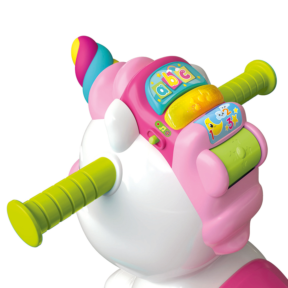 Η Ρίνα είναι η ονειρεμένη φίλη των μικρών κοριτσιών! Ένας χαριτωμένος μονόκερος με πολλές δραστηριότητες παιχνιδιού για ατέλειωτες ώρες διασκέδασης, ο οποίος λειτουργεί και σαν κέντρο δραστηριοτήτων. Μπορεί να χρησιμοποιηθεί σαν κουνιστός μονόκερος ή στράτα. Με εργονομική σέλα και 4 ανθεκτικούς τροχούς για τη μέγιστη αντοχή στο βάρος του παιδιού. Διαθέτει πλήκτρο ΑΒΓ, πλήκτρο ζώων, περιστρεφόμενος κύλινδρος 123, αισθητήρας αφής και κίνησης κάνοντας το παιχνίδι μοναδικό! Η ηλεκτρονική χαίτη αποτελεί ένα εκπαιδευτικό κέντρο δραστηριοτήτων που αναπτύσσει τη φαντασία. – Ας παίξουμε μαζί. Η εκπαιδευτική χαίτη μαθαίνει στο παιδί τα πρώτα γράμματα, τους αριθμούς, τα χρώματα, τα ζώα και τους ήχους τους και πολλά ακόμη, μέσα από διασκεδαστικά ποιηματάκια και τραγουδάκια. – Ας παίξουμε στα Αγγλικά: Το παιδί μαθαίνει τα ζωάκια, τα χρώματα και πολλές νέες λέξεις στα αγγλικά – Φρόντισέ με!: Παίζοντας το παιδί αναπτύσσει τη φαντασία και ικανοποιεί την ανάγκη μίμησης, ενώ διασκεδάζει χαϊδεύοντας και φροντίζοντας τον χαριτωμένο μονόκερο. – Αισθητήρας κίνησης: Ο μονόκερος αντιλαμβάνεται τη κίνηση και ενεργοποιεί αληθινούς ήχους και μελωδίες – Αισθητηριακή ανάπτυξη: Διεγείρει την οπτική, ακουστική και απτική αντίληψη – Γνωστική ανάπτυξη: Βοηθά στην κατανόηση της σχέσης αιτίας-αποτελέσματος και προάγει τη μάθηση. – Ψυχοκινητική ανάπτυξη: Διεγείρει το συντονισμό των κινήσεων. – Συναισθηματική ανάπτυξη: Παίζοντας με το μονόκερο και φροντίζοντάς τον, το παιδί διεγείρει το αίσθημα στοργής και τη φαντασία Μέγιστο βάρος 20 κιλά. Τα παιχνίδια της σειράς Baby Clementoni βοηθούν τους γονείς να επικοινωνούν και να αλληλεπιδρούν με το μωρό από τις πρώτες ημέρες της ζωής του. Με καινοτόμο σχεδιασμό και χρώματα, μη τοξικά και ανθεκτικά υλικά, καθώς και με ανάγλυφες επιφάνειες και πολλές δραστηριότητες ευνοούν την ανάπτυξη των οπτικών, απτικών και ακουστικών ικανοτήτων, την κινητική δραστηριότητα και τους πρώτους λογικούς συσχετισμούς.