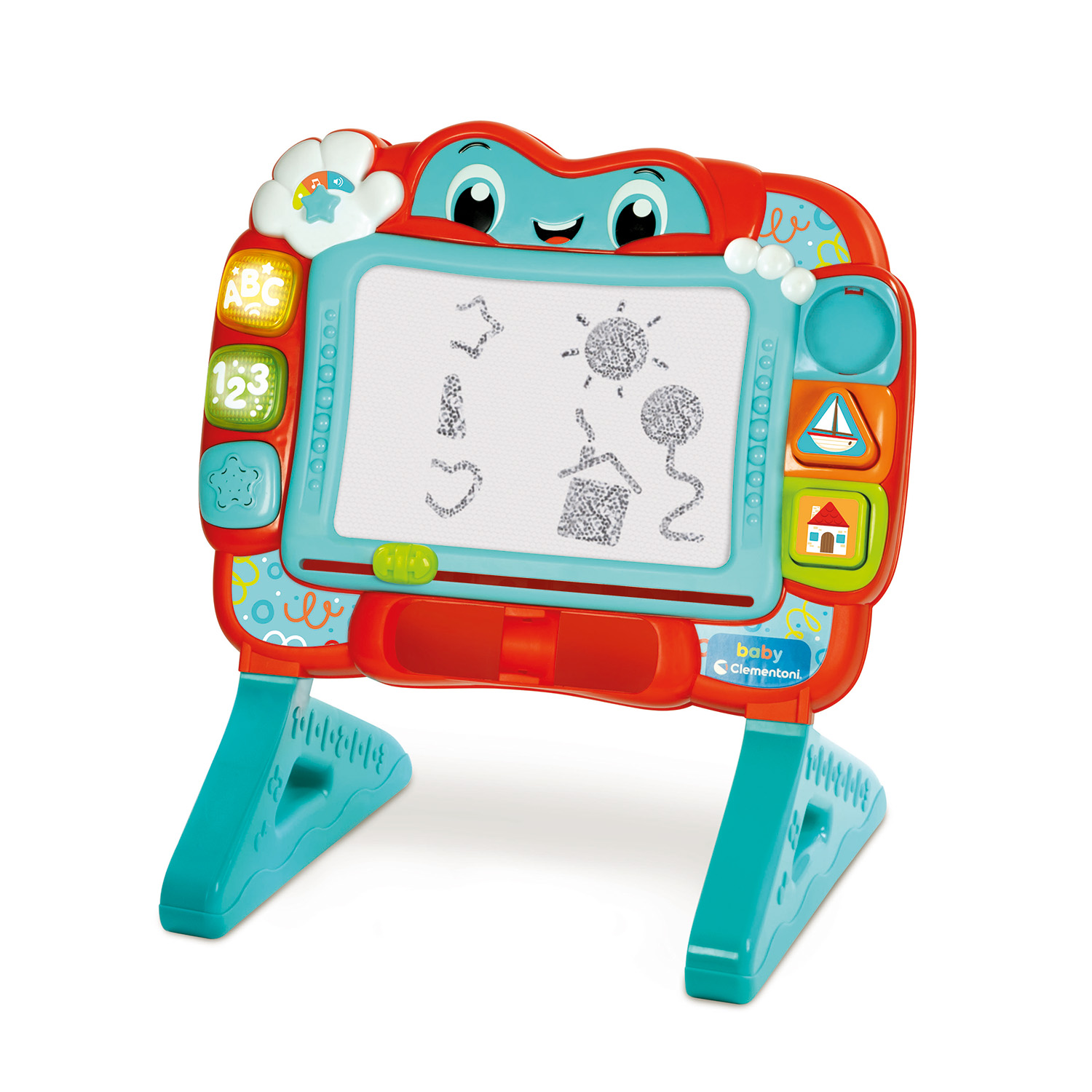 Ένα μοναδικό προϊόν με χαρακτηριστικά που δεν υπάρχουν στην αγορά για αυτή την ηλικία. Ένας πίνακας – παιχνίδι, ειδικά σχεδιασμένος για τα μικρά παιδιά. Το παιδί ακούει μελωδίες και πολλούς διασκεδαστικούς ήχους ξεκινάει να ζωγραφίζει με τις σφραγίδες και μετά με το μολύβι. Οι 3 τρόποι τοποθέτησης του πίνακα ακολουθούν τη σωματική ανάπτυξη του παιδιού. Χαρακτηριστικά προϊόντος – 2 σε 1 : Κέντρο δραστηριοτήτων & Ζωγραφικός Πίνακας – 3 Θέσεις παιχνιδιού : Οριζόντια – Κάθετη – Πλάγια – Εκπαιδευτικό κέντρο δραστηριοτήτων : Γράμματα και Αριθμοί Τα παιχνίδια της σειράς Baby Clementoni βοηθούν τους γονείς να επικοινωνούν και να αλληλοεπιδρούν με το μωρό από τις πρώτες ημέρες της ζωής του. Με καινοτόμο σχεδιασμό και χρώματα, μη τοξικά και ανθεκτικά υλικά, καθώς και με ανάγλυφες επιφάνειες και πολλές δραστηριότητες ευνοούν την ανάπτυξη των οπτικών, απτικών και ακουστικών ικανοτήτων, την κινητική δραστηριότητα και τους πρώτους λογικούς συσχετισμούς.