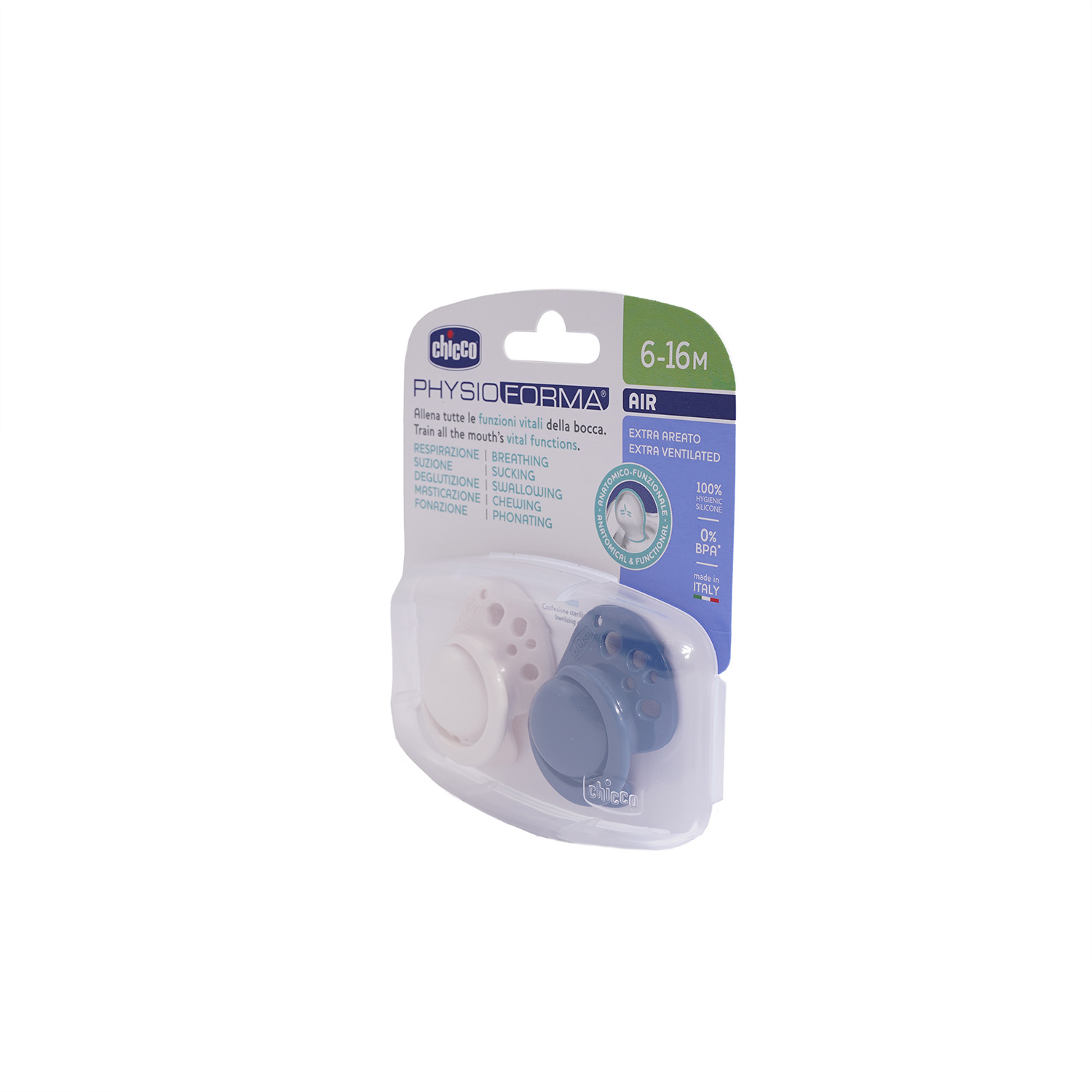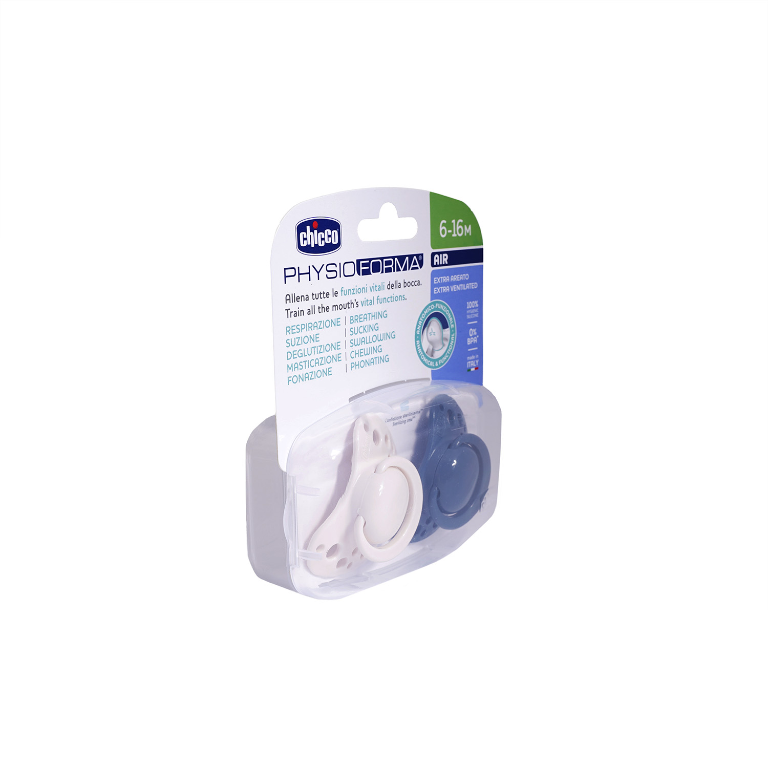 Η πιπίλα Air έχει εργονομικό σχεδιασμό, για να προσαρμόζεται σωστά στο στόμα του μωρού. Προωθεί την σωστή θέση της γλώσσας. Κατανέμει σωστά την πίεση στην άνω γνάθο, για την σωστή ανάπτυξη του στόματος. Ιδιαίτερα λεπτή βάση για σωστό κλείσιμο του στόματος.