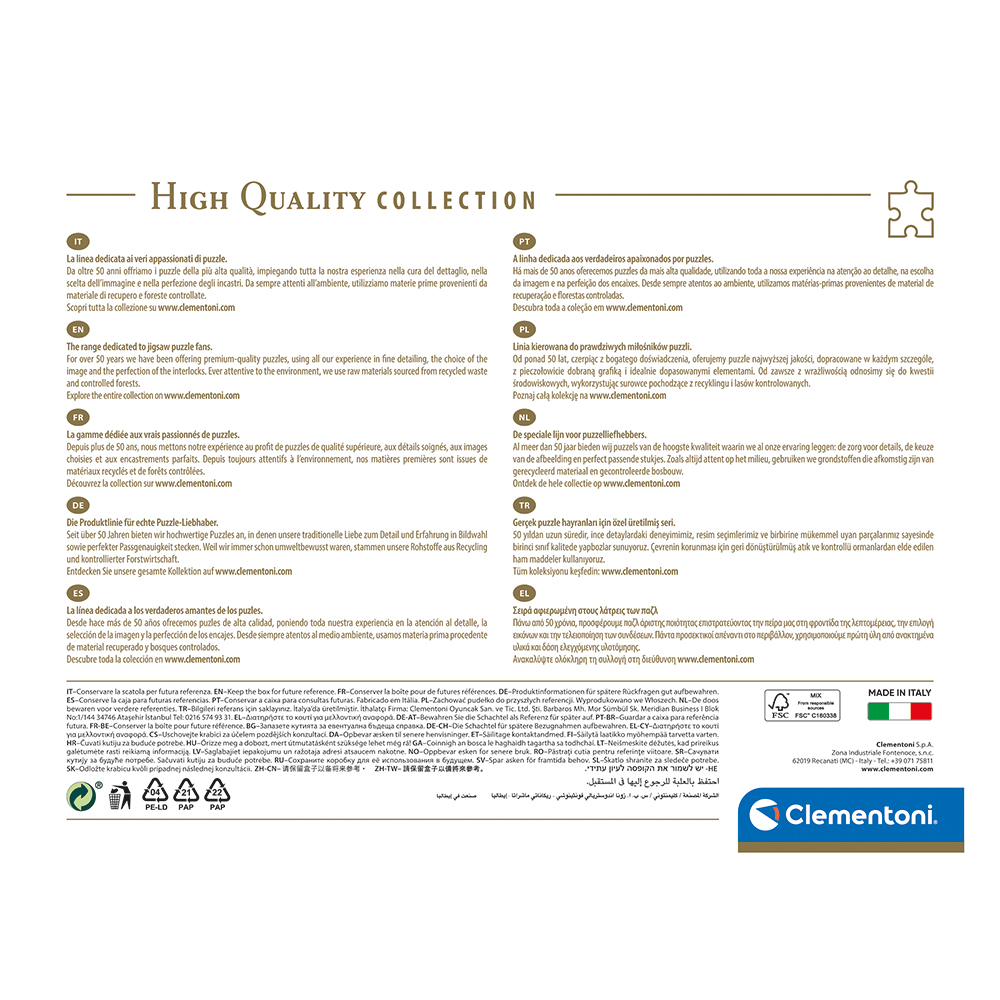 Clementoni Παζλ 1000 τεμαχίων της σειράς Impossible με θέμα Squid Game. Η σειρά παζλ Clementoni Impossible είναι από τα πιο δύσκολα και σχεδόν ακατόρθωτα παζλ στον κόσμο. Το Παιχνίδι του Καλαμαριού (Squid Game) είναι ένα Νοτιοκορεάτικο δράμα επιβίωσης του Netflix. Οι εικόνες της πολυσυζητημένης σειράς ζωντανεύουν μέσα από τα παλζ της Clementoni. Συντονισμένα με τη σημασία της περιβαλλοντικής ευαισθητοποίησης, τα παζλ Clementoni φτιάχνονται με εκτεταμένη χρήση ανακυκλωμένων υλικών, αποφεύγοντας παράλληλα τη χρήση από τυχόν συστατικά που περιέχουν ρύπους. Τεμάχια Παζλ: 1000 Σειρά: Impossible Collection Διαστάσεις Ολοκληρωμένου Παζλ: 70x50cm Κατασκευάζεται στην Ιταλία Τυπωμένο σε αντιθαμβωτικό χαρτί Κομμάτια από χοντρό ανθεκτικό χαρτόνι