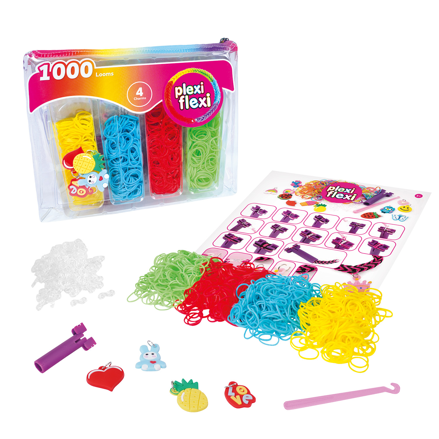 Τσαντάκι με 1000 πολύχρωμα λαστιχάκια και 4 αξεσουάρ για διακόσμηση. Δημιουργήστε μοναδικά και πολύχρωμα βραχιολάκια, δαχτυλίδια, μπρελόκ και άλλα αξεσουάρ και κάνετέ τα ακόμα πιο εντυπωσιακά προσθέτοντας πολύχρωμα αξεσουάρ σε μοναδικά σχέδια. Ιδανικό για παιδιά που αγαπούν τις χειροτεχνίες και θέλουν να εκφράσουν τη δημιουργικότητά τους. Διατίθεται σε μοδάτο τσαντάκι το οποίο διευκολύνει το παιδί να πάρει μαζί του όλα τα λαστιχάκια και τα αξεσουάρ του και να φτιάξει οπουδήποτε φανταστικά βραχιολάκια παρέα με τους φίλους του. Το σετ περιλαμβάνει: – 1000 πολύχρωμα λαστιχάκια σε 4 χρώματα – 4 πολύχρωμα αξεσουάρ – Μίνι αργαλειό – Τσιγκέλι – 130 κουμπώματα – Εγχειρίδιο οδηγιών – Όλα αυτά σε ένα μοδάτο & χαριτωμένο τσαντάκι! Διατίθεται σε 2 διαφορετικά χρώματα και με διαφορετικά charms, για να διαλέξεις αυτό που ταιριάζει καλύτερα στο στυλ σου. Τι είναι τα Plexi Flexi? H σειρά Plexi Flexi χρησιμοποιεί εύκαμπτα λαστιχάκια με τα οποία τα παιδιά μπορούν να δημιουργήσουν εύκολα τα δικά τους σχέδια με αλλά και χωρίς τη χρήση εργαλείων. Τα προϊόντα της σειράς είναι κατασκευασμένα από υψηλής ποιότητας και ασφαλή για το δέρμα υλικά, ενισχύουν την δημιουργικότητα, την υπομονή και τις λεπτές κινητικές δεξιότητες των παιδιών. Η σειρά αποτελεί ιδανική επιλογή για δραστηριότητες σε ομάδες μεταξύ της οικογένειας ή και φίλων, προσφέροντας ώρες διασκέδασης και δημιουργικότητας.