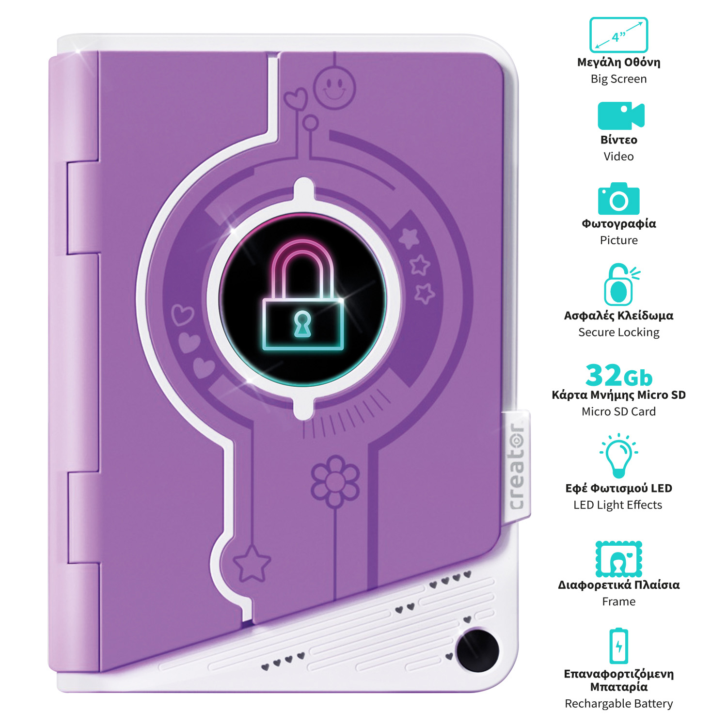“Κράτησε τα μυστικά σου ασφαλή σε βίντεο με Το Ηλεκτρονικό Ημερολόγιο Secret Creator! Ξεκλείδωσε το ημερολόγιό σου με το δακτυλικό σου αποτύπωμα και κατάγραψε τις καθημερινές σου περιπέτειες σε βίντεο. Δημιούργησε μοναδικά βίντεο Πρόσθεσε διασκεδαστικά φίλτρα που μπορείς να αλλάζεις όσο καταγράφεις. Επιπλέον, τα 10 διαφορετικά LED χρώματα γύρω από την οθόνη δημιουργούν φανταστικά εφέ που μπορούν να αλλάζουν σε κάθε βίντεο! Δακτυλικό αποτύπωμα για απόλυτη μυστικότητα Καταχώρησε και τα 10 δάχτυλά σου και διάλεξε κάθε μέρα διαφορετικό “”κλειδί”” για να ξεκλειδώνεις το ημερολόγιό σου. Νιώσε απόλυτα ασφαλής και κράτησε τα μυστικά σου μόνο για σένα. Αποθήκευση & αναπαραγωγή Όλα τα βίντεό σου αποθηκεύονται με ημερομηνία και μπορείς να τα ξαναδείς όποτε θέλεις. Και αν δεν έχεις σήμερα κάτι να πεις, μπορείς απλά να τραβήξεις φωτογραφίες ή να απαντήσεις σε μια από τις ερωτήσεις που έχει για σένα το ημερολόγιό σου. Ασταμάτητη διασκέδαση Με επαναφορτιζόμενη μπαταρία, το Video Diary σε ακολουθεί όπου κι αν πας χωρίς να σε σταματά τίποτα! Περιεχόμενα συσκευασίας: – 1 Ηλεκτρονικό βίντεο ημερολόγιο – 1 Κάρτα SD 32GB – 1 Καλώδιο USB-C – Αυτοκόλλητα – 1 Εγχειρίδιο Χρήσης”